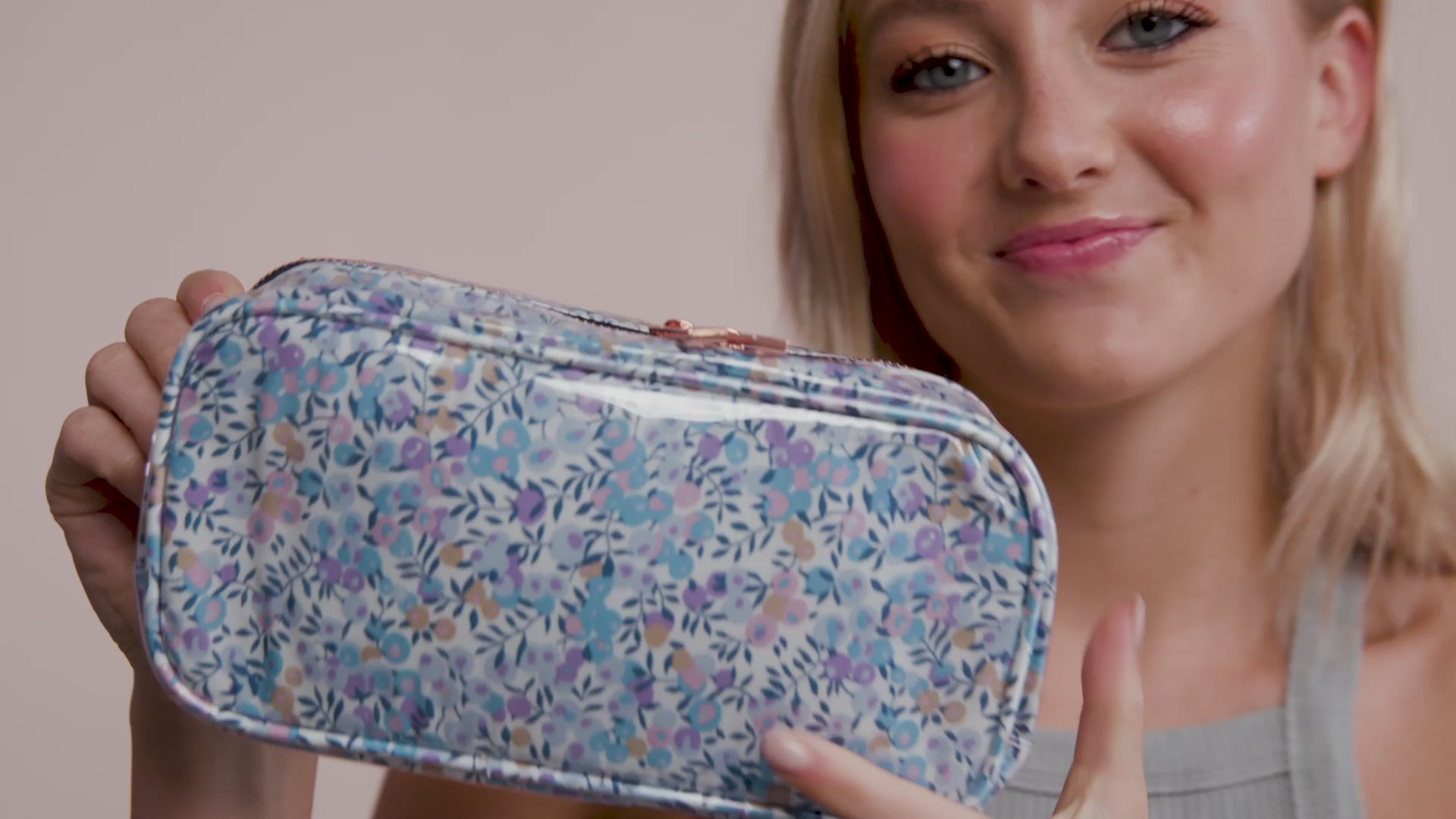 A sleek, long and lightweight cosmetics bag that holds all your makeup must-haves, including brushes and pencils.
